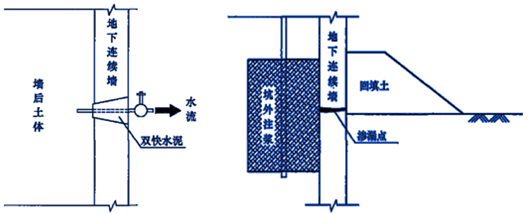 (2)如果渗漏较为严重直接封堵困难时,则应首先在坑内回填土封堵水流,然后在坑外打孔灌注聚氨酯或水泥-水玻璃双液浆等封堵渗漏处,封堵后再继续向下开挖基坑。