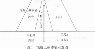 根据示意图中的混凝土截渗墙布置和各区段地质情况,截渗墙施工中质量较难控制的区段是:区段2。
