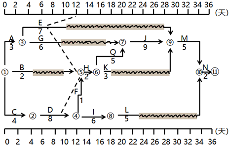 (或实际工作天数、或完成工作时间)为5天;波浪线长度表示其自由时差(或总时差)为11天。