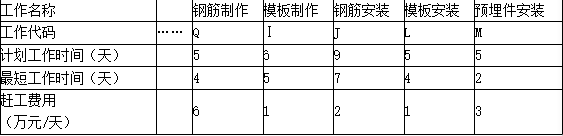 根据增加费用最小的原则,首先选择J工作(或钢筋安装),压缩2天(或工作时间从9天调整为7天);其次选择M工作(或预埋件安装),压缩1天(或工作时间从5天调整为4天),增加费用为7万元。