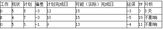 D工作已完成5天工作量,延误3天,推迟(或影响)工期3天。