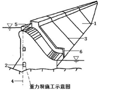 <1>.1:非溢流重力坝;2:基础灌浆廊道;3:横缝;4:防渗帷幕;5:闸门;6:导墙。