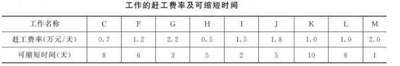 ②工作F、I、K、M作为可压缩对象,由于工作K的赶工费率1.0万元/天为最小,故选择工作K压缩。