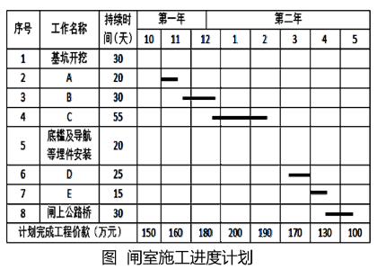 (2)基坑开挖工作的计划开始时间为第一年10月1日,计划完成时间为第一年10月30日;底槛及导轨等埋件安装的计划开始时间为第二年2月16日,计划完成时间为第二年3月5日。