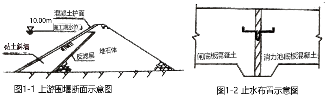 (3)粘土斜墙顶高程不妥,土石围堰防渗体顶部在设计洪水静水位以上的加高值,斜墙式防渗体为0.8-0.6m;