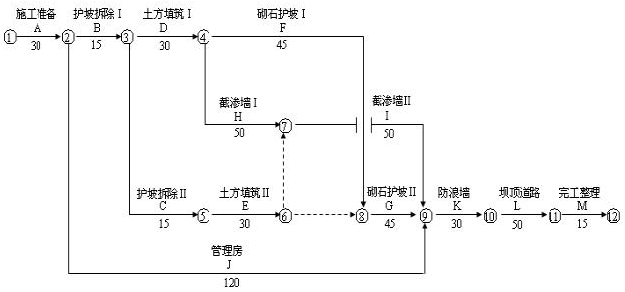 3.F 工作已完成4 天工程量,H 工作已完成8 天工程量,E 工作已完成10 天工程量,I 工作已完成25天工程量,H、J 工作拖延对工期有影响,H 工作的延误对工作影响3 天,J 工作的延误对工期影响5 天。