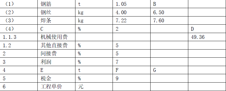2.A:工长;B:2560.00;C:其他材料费;D:55.38;E:材料补差;F:1.05;G:914.65。