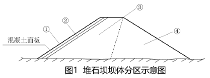 1.①-垫层区 ②-过渡区 ③-主堆石区 ④-次堆石区(或下游堆石区)