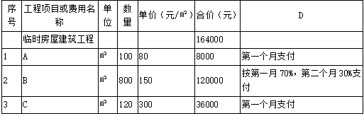 A施工单位生产用房;B施工单位生活用房;C发包人、监理人、设计人生活用房;D备注(支付时间及金额)