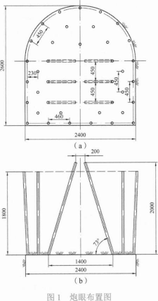 (2)炮眼布置无法保证取得光面爆破效果。理由:周边眼间距450mm左右合理,但最小抵抗线为230mm偏小,炮眼密集系数为450/230=1.95,与合理值区间0.8~1.0偏差较大,难以取得光面爆破的效果。