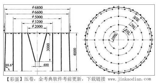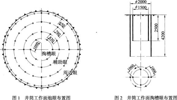 3.井筒基岩坚硬岩层段爆破,周边眼的布置应根据光面爆破的要求进行布置,周边眼的间距E通常为400~500mm,周边眼与最小抵抗线w的比E/w应满足0.8~1.0的要求。