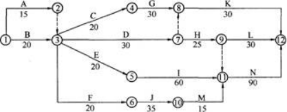 某矿井主、副井筒掘进同时到底,井筒工程结束后迅速转入井底车场施工。井底车场施工进度网络计划如下图所示(图中时间单位为天)。实际施工中M工作因断层破碎带拖延15d,H工作因施工方案调整,工作持续时间更改为40d。