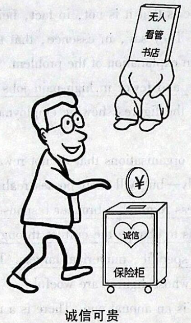 In the picture above,in an unattended bookstore where there is no cashier and no staff,a customer is paying for the book he has chosen of his own free will.Such a bookstore is basically based on the customers'integrity.This illustration reveals the importance of integrity in todays society.cheif ieav-os onion,toona when no one is around There are many reasons why integrity is important Integrity means doing the right thing even when no one is around in our lives.First,living a life of integrity means that we never have to spend time or energy questioning ourselves.When we listen to our hearts and do the right thing,life becomes simple.Our actions are open to others,and we don't have to worry about hiding anything.What's more,when we have integrity,we gain the trust of others.We're dependable,and we become role models for others to follow when we hold ourselves accountable for our actions In our lives,we are going to be tested at one point or another by our integrity and ethics.Every time we do what we think is the right thing even though no one else sees us do it,we have taken a big step toward strengthening our integrity