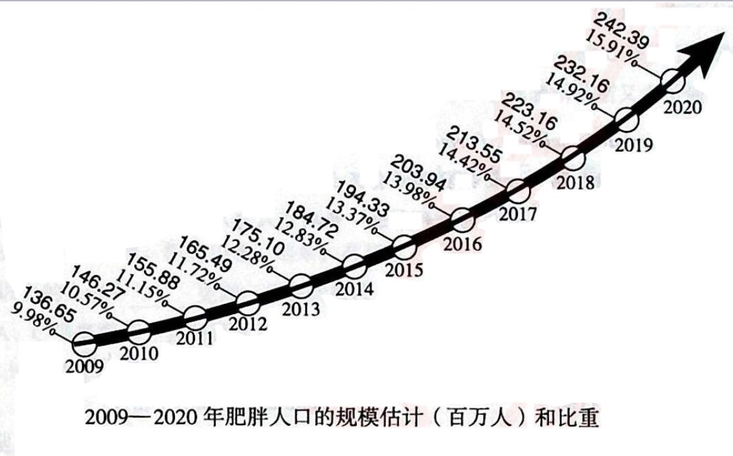 The chart given above reflects the scale and proportion of the obese population between 2009 and 2020.Both the scale and the proportion are on the rise.Several factors,to my way of thinking,can be easily found to account for the phenomenon among which I would like to name three most significant ones as follows.At the first place,obesity is closely related to sugar intake.Sugar can add calories to everything you eat.Second,fast food restaurants are scattered all over the country,you know,fast food is high in calories and fat.Third,computers and games have bad effect on obesity,but their effect is less pronounced.It's a good idea to limit your computer,games and TV time to less than two hours a day.To conclude,such a trend will probably develop more dramatically in the future.Therefore,it is wise to take some measures to reverse such trend,and to keep healthy.