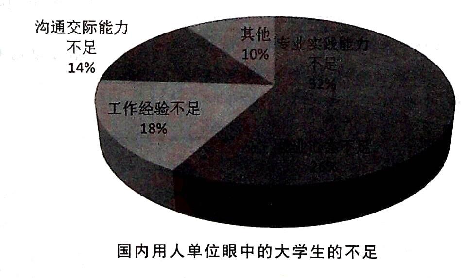 The above pie chart illuminates the shortcomings of fresh graduates as perceived by employers.As is clemonstrated in the diagram,up 10 32%of employers lament gracluates'lack of ability to solve practical professional problems,next comes the concern over graduates'unreacliness to work,accounting for 26%.In an increasingly competitive job market,a good degree could no longer guarantee a decent job.Today's employers are putting increasing emphasis on candidates'problem-solving skills and the correct mindset to get a job which are unforiunately found missing from most young graduates.College students usually dedicate time and effort to theoretical knowledge while seldom engage in work-related learning activities.Moreover,few students have iclentified their career paths by the time they leave university.They prioritize salary over everything else and hold unrealisitic expectations.To assure smooth integration into professional life,and hence into society,students need to equip themselves with a battery of professional practical skills and develop a career plan aligned with their abilities and interests instead of continuing to moan about the lack of employment opportunities.