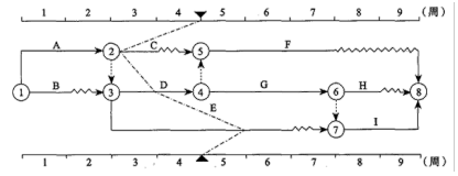 某工程双代号时标网络计划执行到第4周末时,检查其实际进度如下图前锋线所示。可以看出( )。