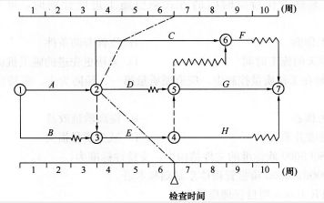 某工程双代号时标网络计划如下图所示,根据第6周末实际进度检查结果绘制的前锋线如点划线所示。通过比较可以看出( )。