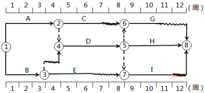 某工程双代号时标网络计划如下图所示,其中工作B的总时差为( )周。