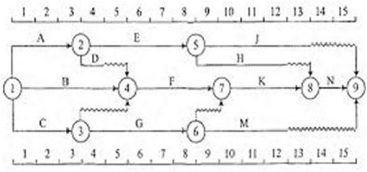 某工程双代号时标网络计划(时间单位:周)。如下图所示,其中工作E的总时差和自由时差是( )。