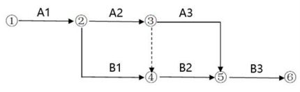 某工程有A、B两项工作,分为3个施工段(A1A2A3,B1B2B3)进行流水施工,对应的双代号网络计划如下图所示,相邻两