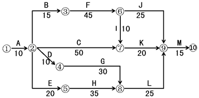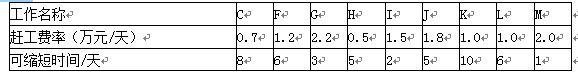 (2)压缩工期应选择关键工作F、I、K、M为压缩对象,为使赶工费最少,首先应选择赶工费率最小的工作K进行压缩。