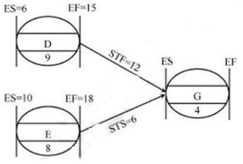 在单代号搭接网络图中,工作G的持续时间为4天,紧前工作有D、E工作。工作D→G之间的搭接关系为STF=12天,工作E→G