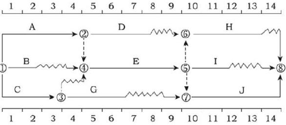 某工程双代号时标网络计划如下图所示,其中工作B的总时差和自由时差( )。