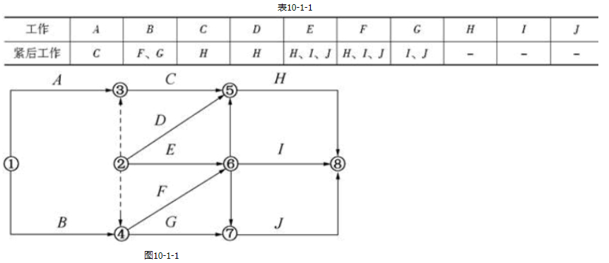 某分部工程中各项工作间逻辑关系见表10-1-1,相应的双代号网络计划如图10-1-1所示,图中错误有( )。