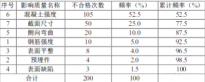 影响质量的主要因素有混凝土的强度和截面尺寸;次要因素有侧向弯曲;一般因素有钢筋强度、表面平整、预埋件和表面缺陷。