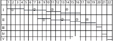 4.I、II工序之间的流水步距为7周,工期=7+12+3=22周,横道图如下: