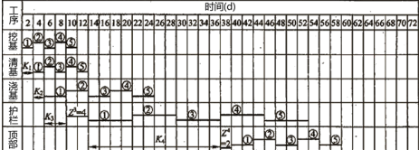 1.计算不窝工流水时的流水工期,绘制流水横道图。该流水施工属于非节奏流水形式组织施工,根据题意第三道工序与第四道工序之间的技术间歇Z^3=4,第四道工序与第五道工序之间的技术间歇Z^4=2。