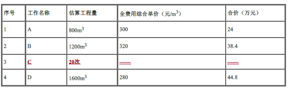A工作:840m3×300元/m3=252000元 B工作:1200m3×25%×320元/m3=96000元 D工作:4台班×100元/台班+1200元=1600元