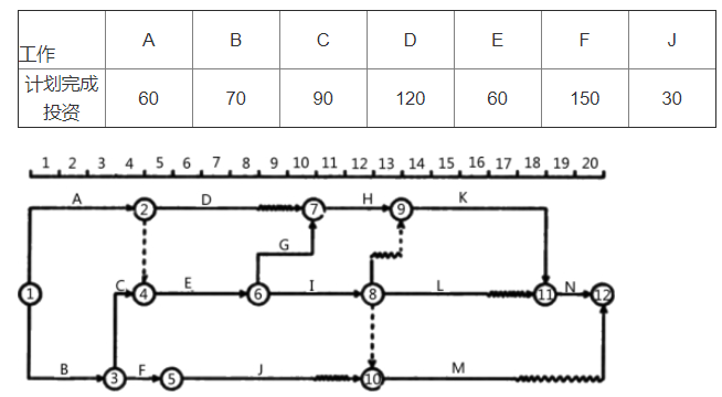 案例题 某工程建设单位与施工单位按照《建设工程施工合同(示范文本)》签订了施工合同,采用可调价施工合同形式。工期20个月,项目监理机构批准的施工总进度计划如下图所示,各项工作在其持续时间内均按匀速进展,每月完成投资如下表所示。