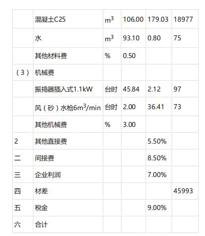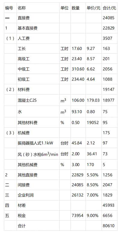 C25混凝土工程(100m3)=直接费+间接费+企业利润+材差+税金 =24085+2047+1829+45993+6656=80610(元)