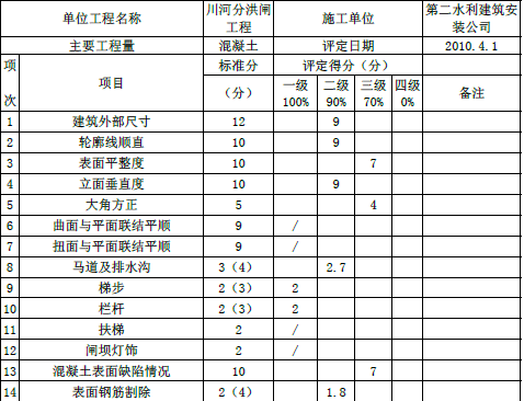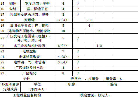 表1 水工建筑物外观质量评定表
