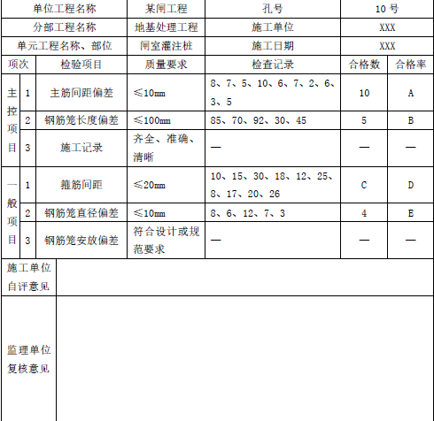 施工单位的自评意见:主控项目检验点全部符合标准要求,一般项目逐项检验点的合格率最小为70.0%,且不合格点不集中分布,工序质量等级评定为合格。