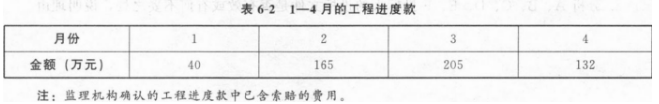 4.工程预付款=600×10%=60(万元)。前3个月累计工程进度款=40+165+205=410(万元)>600 × 60%=360(万元),应在3、4月平均扣回预付款,每月扣回30万元。3月应支付的工程进度款=205×(1—5%)—30=164.75(万元)。