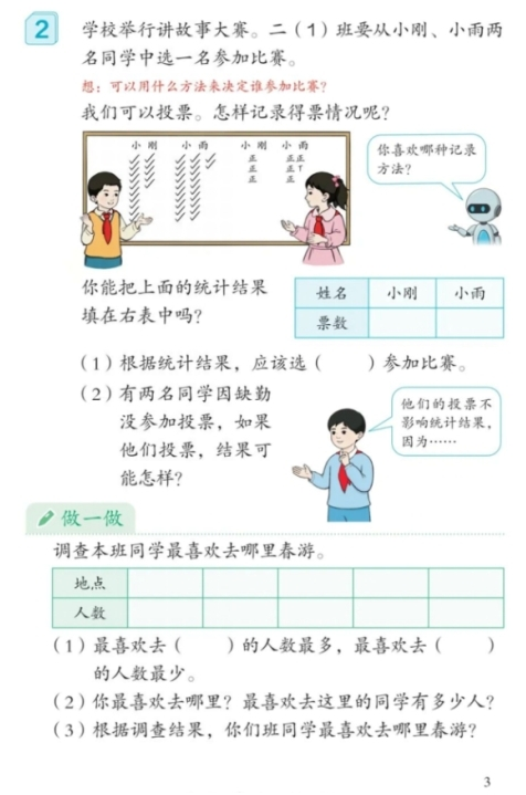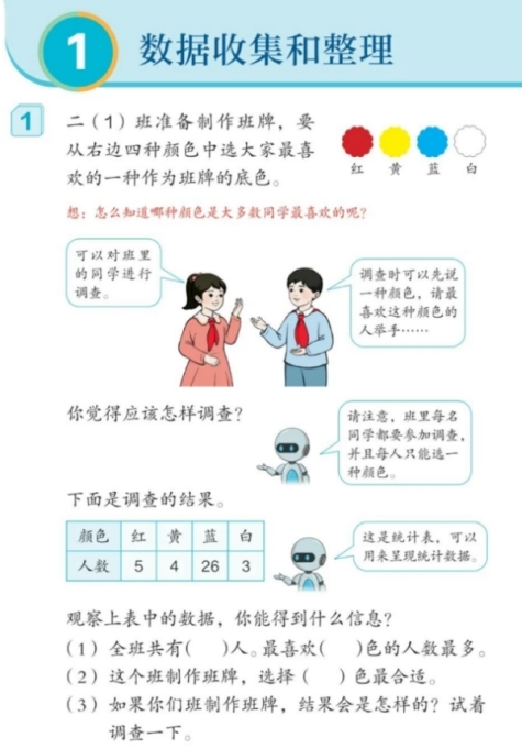 ①掌握用调查法收集数据及用“正”字记录数据的方法,认识统计表,会用给定的统计表呈现和整理数据。