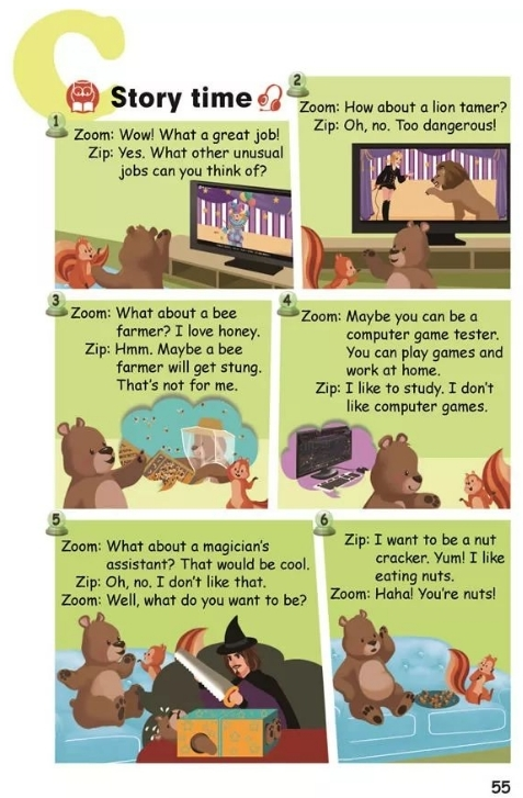 Students can master words: “Lion tamer, bee farmer, computer game tester, magician’s assistant, nut cracker”, and sentence structure “What/How about...?”