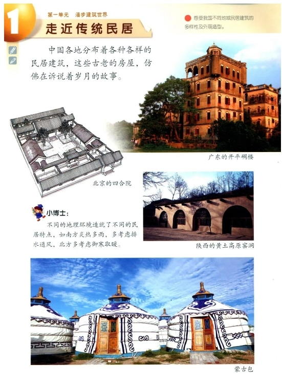 教师引导学生回忆生活中了解的民居建筑,请学生分享感受。学生回答后,教师利用多媒体进行总结:北京的四合院、福建的土楼、陕西的窑洞都是传统民居的代表。