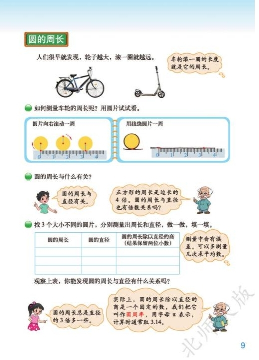 教师活动:教师提出问题:如何测量车轮的周长呢?用圆片试试看。请学生拿出学具袋中的圆片以及绳子、卷尺、直尺等工具,想办法量一量。教师组织学生四人小组交流讨论,教师进行巡视指导,交流讨论结束后,找学生代表回答讨论的结果,教师评价。