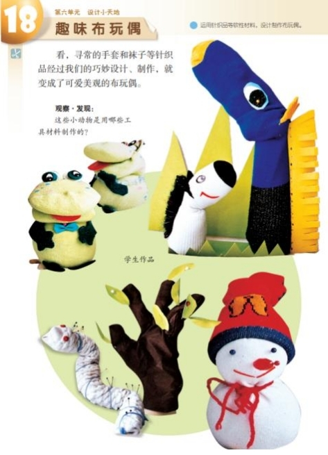 ①了解布玩偶的材料,掌握制作布玩偶的方法,并制作立体布玩偶作品。