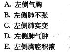 单项选择题 男性,30岁。2周前出现干咳,伴有午 后低热、盗汗、左胸痛,近几日自觉左胸痛 好转,但出现气促,夜间喜在拥卧位。査 体:气管向右侧移位,左侧靡较右侧稍饱 满,左侧呼吸运动减弱,左側触觉语顱减 弱,听诊左侧呼吸音消失,双肺未闻干湿 啰音.