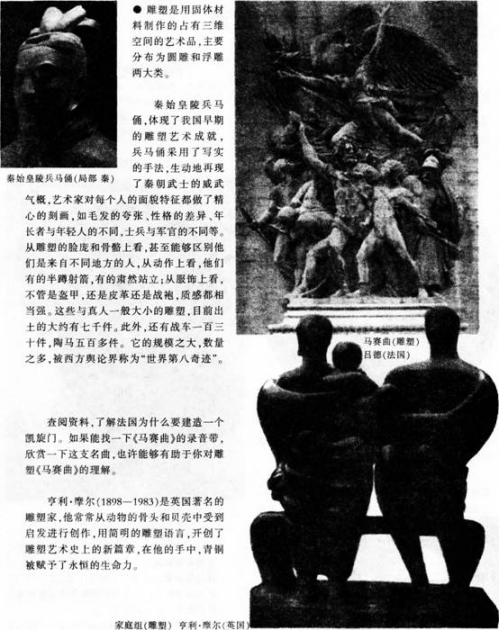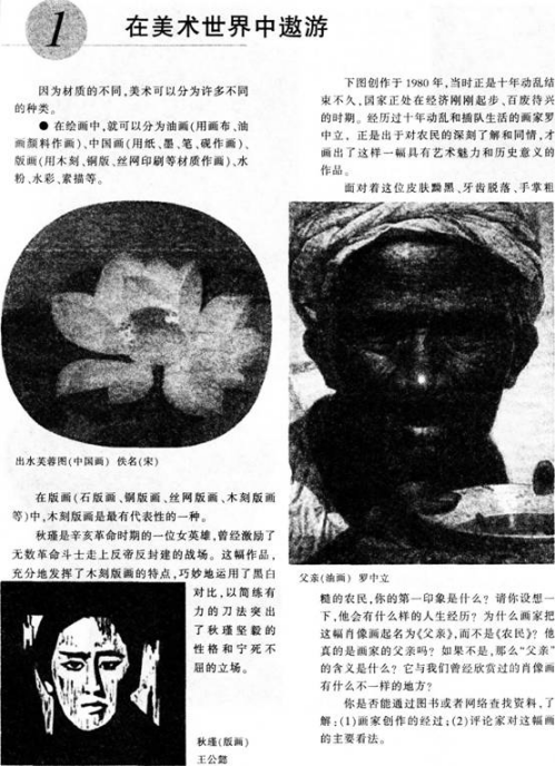 ③教师首先充当导演,让学生在游戏中,一边看作品,一边正确地找出作品使用的材料。让学生甲指出油画《父亲》,学生乙找出油画用的材料;学生甲出示卡片“浮雕”,学生乙找出书上图片中的浮雕;学生甲出示“水彩画”的卡片,学生乙就要从课本外找出一张水彩画的作品。让学生在游戏中分清楚作品是用什么材料完成的。