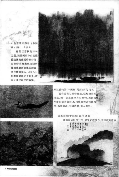 (设计意图:通过展示中国山水画名作,使学生感受中国画的艺术境界,引起学生创作兴趣)