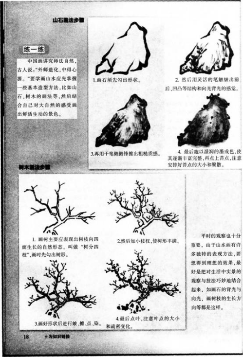 2,山水画的树石绘画步骤与方法。