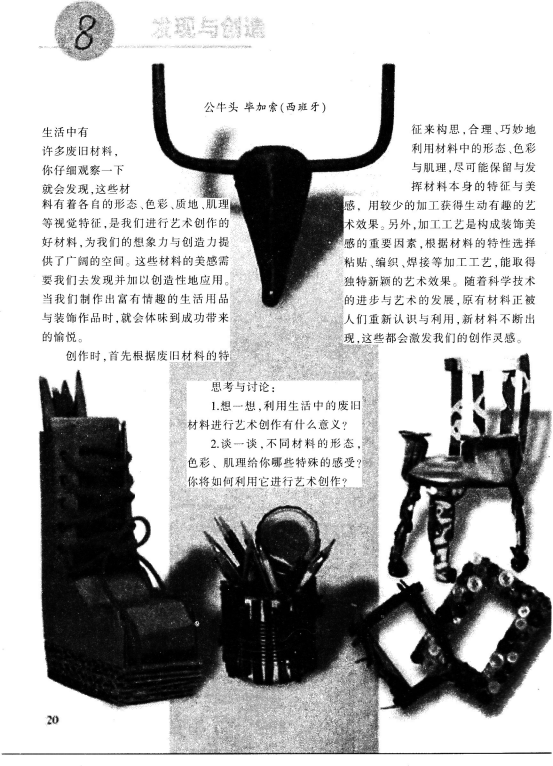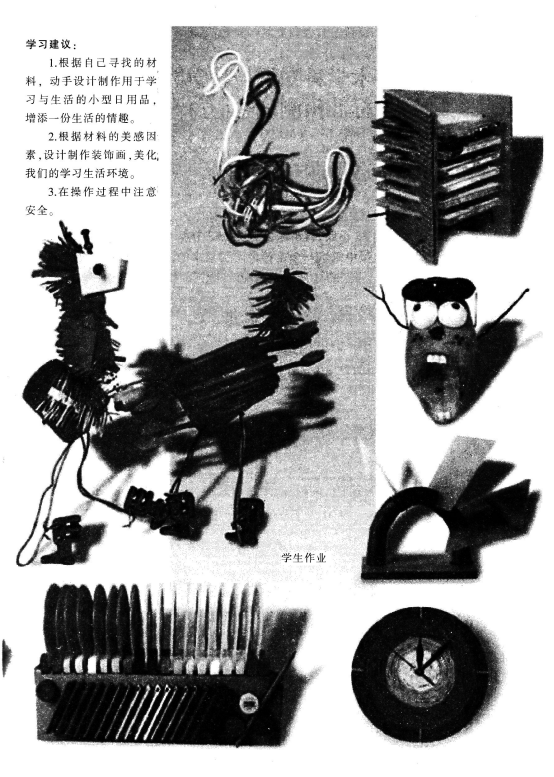 教学重点:观察、发现材质的美感,运用艺术的手段和丰富的想象力对材料进行合理的利用,创造出具有实用价值和审美特征的新作品。