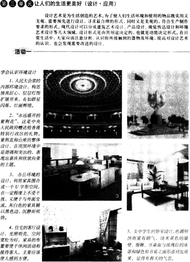 2.通过案头小工艺品的设计制作练习,掌握实用和美观有机结合的设计原则;能自觉地以艺术的眼光观察和分析常见的生活用品,并用恰当的语言进行评述。