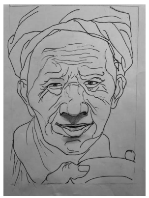 问答题 用线条勾勒出罗中立油画作品《父亲》的构图样式、主体形象标志性细节,并描述其艺术特点。