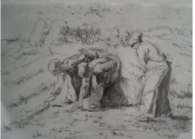 问答题 用线条勾勒出法国画家米勒作品《拾穗者》的大体形象。